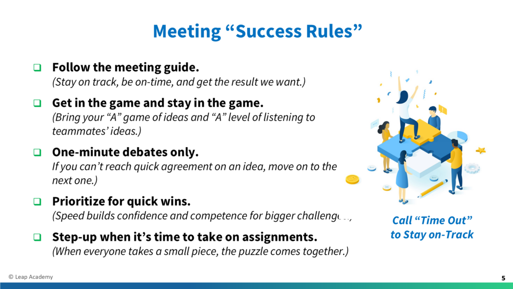 [Before Speaking] Be sure Success Rules slide is on screen. [To Read Aloud] Successful teams stick to these five common sense, but not always commonly practiced, behaviors. (Ask team members to take turns reading each rule to increase retention.) If these ground rules aren’t being followed, anyone can call a “Time Out.” During a Time […]