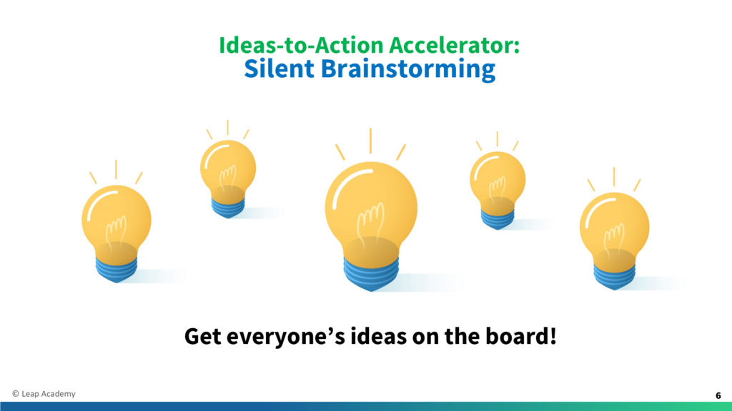 [Before Speaking] Be sure Silent Brainstorming slide is on screen. [To Read Aloud] Through our meeting, we’ll use Ideas-to-Action Accelerators – proven practices for getting results. Our first accelerator is Silent Brainstorming for quickly capturing everyone’s ideas. We’ll work individually and quietly because this generates more ideas and reveals our different perspectives. When we work […]