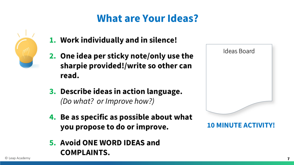[Before Speaking] Be sure What are Your Ideas slide is on screen. Have the Ideas Board flipchart posted in an accessible location. Distribute sticky notes and sharpies to each person. Set timer for 10 minutes. [To Read Aloud] Here’s how we’ll capture everyone’s ideas. (Ask team members to take turns reading each numbered instruction.) Key […]