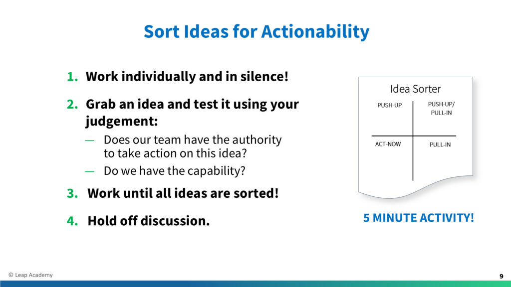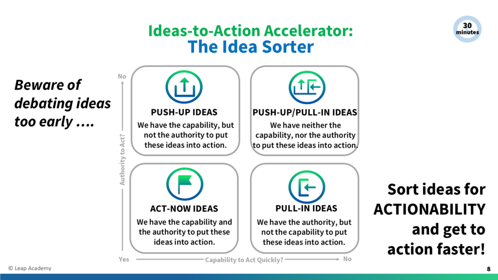 [Before Speaking] Be sure the Idea Sorter slide is on screen. Have the Idea Sorter flipchart posted close by the Ideas Board for easy transfer of sticky notes. [To Read Aloud] Now we’ll use our next Action Accelerator: The Idea Sorter. Many teams make the mistake of debating ideas too early. Instead, we’ll first sort […]
